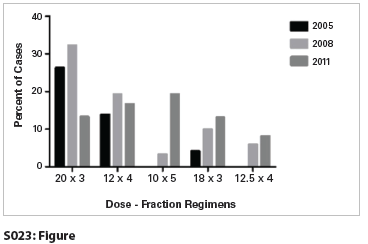 Conclusion: Our findings suggest that despite phase II evidence demonstrating the best published local control and overall survival to date with a regimen of 54 Gy in 3 fractions (corrected), over 25% of patients with stage I NSCLC treated with SBRT in recent years have been prescribed regimens that provide a BED of less than 100. Possible explanations for this include the increasing use of SBRT for treating centrally located tumors or tumors near organs at risk and increased adoption of SBRT by physicians who are new to the technology and, consequently, more conservative in their target prescription BED.