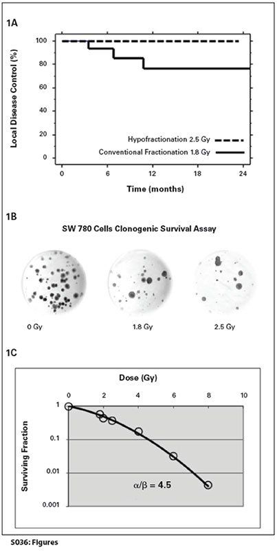 Results: No patients who received hypofractionated treatment had local failure in the bladder. There were only three LENT-SOMA late grade 3 ureteral toxicities (2 CF, 1 HF) and one acute grade 4 renal toxicity (CF), all of which resolved with management of ureteral obstruction. There appeared to be a difference in 2-year local control: 100% HF (7/7) vs 82% CF (13/16) [see Figure 1A]. The alpha-beta ratio was calculated to be 4.5 Gy for SW780 cells [Figures 1B, 1C].