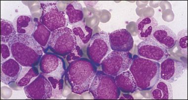 © Prof. Jean Bonhomme   Photomicrograph of chronic myeloid leukemia, also known as myelogenous leukemia, from a blood smear, mag. 350 (at 24 × 36 mm).