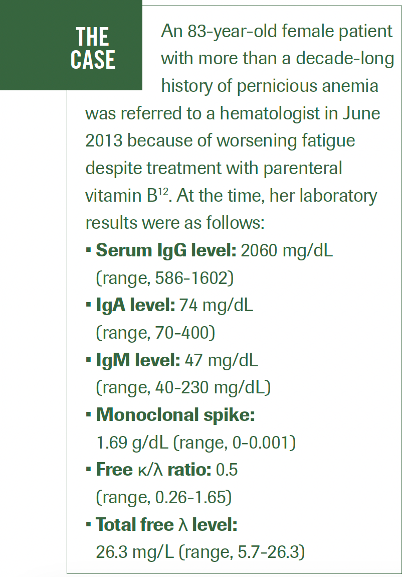 microglobulin level was 2.3 mg/L (range, < 2.16). Bone marrow showed less than 5% plasma cells, translocation t(11;14), and hyperdiploidy, as well as a gene expression risk stratification profile score of 22. However, no lytic lesions were present. She was diagnosed with monoclonal gammopathy of undetermined significance and was followed expectantly.