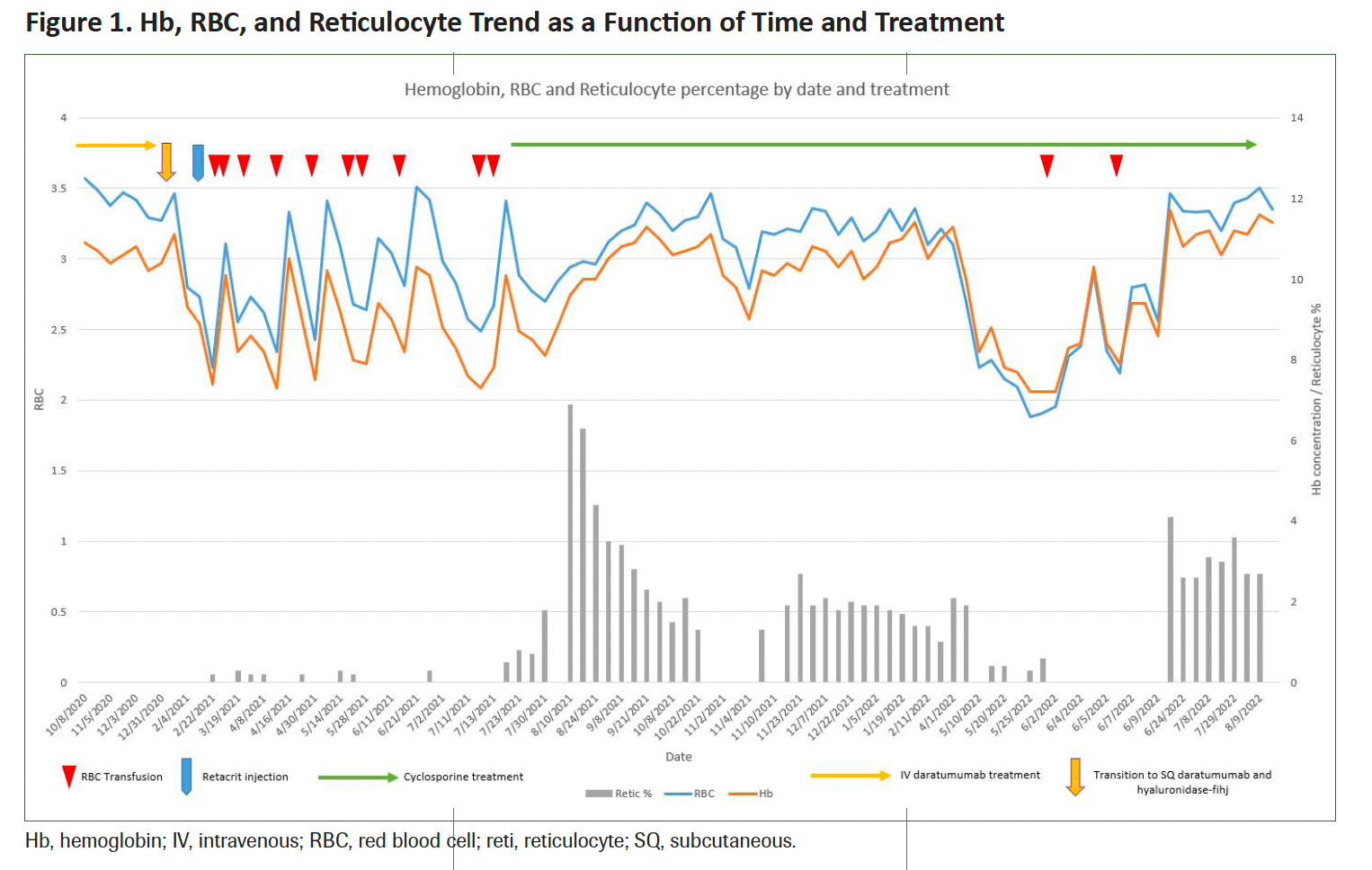 Figure 1 illustrates the trends in hemoglobin, red blood cell count, and reticulocyte levels over time, showcasing the impact of treatment. The levels of vitamin B12, iron, folate, zinc, and copper were normal. Daratumumab/hyaluronidase therapy was discontinued, and she was monitored without any further anti–plasma cell therapy.