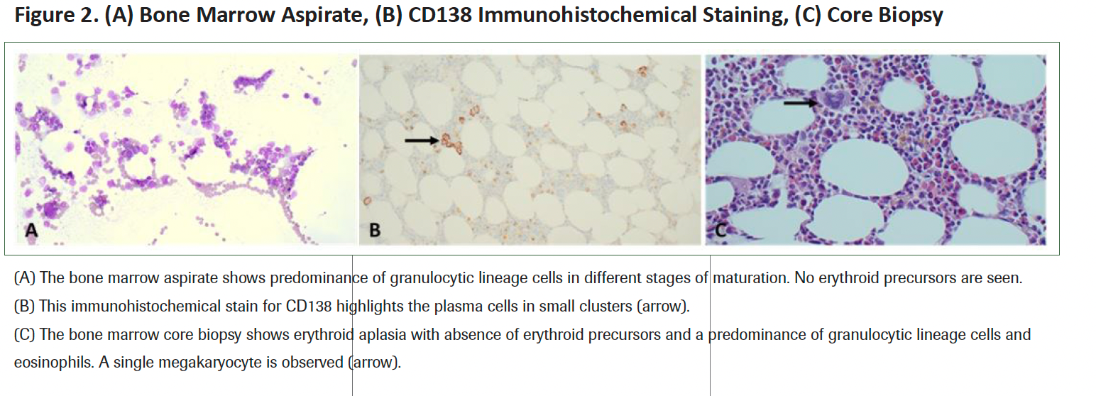 Parvovirus B19 DNA polymerase chain reaction test results were negative, and serology reported remote infection (normal immunoglobulin [IgM], elevated IgG). A bone marrow biopsy showed normal trilineage hematopoiesis, megakaryopoiesis, granulocytic maturation, and absent erythropoiesis consistent with PRCA (Figure 2). No clonal plasma cells were detected by flow cytometry, and immunohistochemistry reported rare CD38+ cells. A myeloid next-generation sequencing panel of 54 genes came back normal except for a clinically significant DNMT3A variant at splice acceptor site c.1475-1G>C.