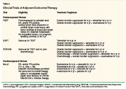 In this article, we will review the various options available and discuss their efficacy, side effects, and relevant ongoing clinical trial options. We will also review the prognostic and predictive factors that can be used to make informed decisions regarding adjuvant therapy. We will present four cases that illustrate difficulties in choosing adjuvant therapy and finally summarize our recommendations and the major consensus for adjuvant hormonal therapy (Table 1). Treatment Options Optimum use of adjuvant hormonal therapy is dependent on menopausal status. Ovarian ablation-either permanent (using surgical or radiotherapeutic ablation) or temporary (using pharmacologic agents such as LHRH agonists)-is a potential strategy for premenopausal women. The aromatase inhibitors are appropriate only for postmenopausal women and can be used in conjunction with LHRH agonists. SERMs such as tamoxifen are a viable option regardless of hormonal status. Table 2 reviews all endocrine therapies used in the treatment of breast cancer. This article will focus only on those treatments indicated for use in adjuvant therapy. Selective Estrogen-Receptor Modulators