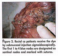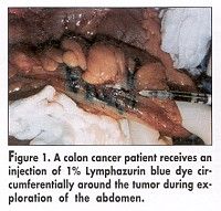 The study involved 214 consecutive colon and rectal cancer patients (164 colon and 50 rectal), ranging in age from 26 to 97, who underwent SLN mapping at the time of surgery. Colon cancer patients received injections of 1 mL to 2 mL of 1% Lymphazurin blue dye circumferentially around their tumors during exploration of the abdomen (Figure 1). Rectal cancer patients received the dye by submucosal injection administered sigmoidoscopic-ally. The first one to four blue nodes found were designated as sentinel nodes and were marked with sutures (Figure 2).