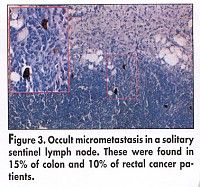 Occult micrometastasis in one solitary SLN was found in 15% of colon and 10% of rectal cancer patients (Figure 3). Accuracy in identifying the presence or absence of metastasis in the SLN was 98% in colon and 90% in rectal cancers. In 5% of patients, the technique leads to a change in the extent of the operation.