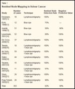 In vulvar cancer, accumulating data indicate that the sentinel node mapping technique is feasible and highly accurate in predicting the status of the inguinofemoral lymph nodes; most studies have also confirmed that the combined technique is superior to the blue dye alone in identifying the sentinel node.[11-22] Puig-Tintor et al recently summarized 12 series published since 1997, totaling 353 cases (Table 1).[22] The negative predictive value was 100%, except in one series (96%). The review also indicates that the sensitivity of the blue dye technique alone in detecting the sentinel node is only 56% to 88% and that the addition of lymphoscintigraphy significantly improves the sentinel node detection rate to nearly always 100%. Their conclusion is that the available data are strong enough to recommend the routine use of sentinel node mapping in the management of vulvar cancer.[22]