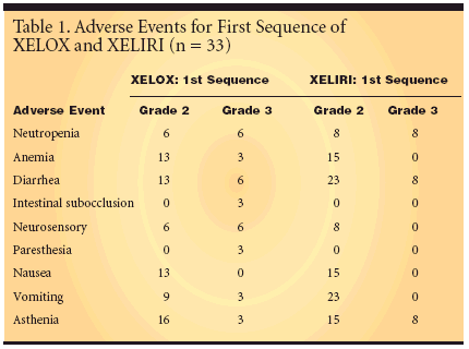 GUADALAJARA, SPAIN-Sequentialcycling of XELOX (capecitabine[Xeloda]/oxaliplatin [Eloxatin])and XELIRI (capecitabine/irinotecan