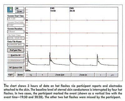 Many women recorded far fewer hot flashes than the researchers documented using electrodes attached to the women’s skin (see Figure). In one case, a breast cancer survivor said she had seven hot flashes in a 24-hour period when a measuring device recorded 26 hot flashes.