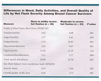 Breast cancer survivors with moderate to severe hot flashes (overall severity rating of 5 or more) had a mean HFRDIS score measuring the effect of hot flashes on overall quality of life of 2.73, compared with 0.44 for breast cancer survivors with no or mildly severe hot flashes (overall severity rating less than 5) (see Table).