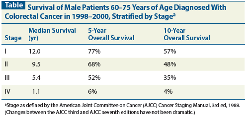 Table: Survival of Male Patients 60–75 Years of Age Diagnosed With Colorectal Cancer in 1998–2000, Stratified by Stagea