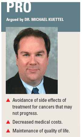 “There have been studies that suggest that delay of treatment may lead to future treatment failure and thus a missed cure,” Dr. Kuettel continued. “However, this is not a short delay of a couple of months, but rather delays of six months or more. There is ample time to help a patient consider all of his choices before selecting a treatment plan.” Thus the best choice of “treatment” for many men with low-risk prostate cancer may be expectant management, but expectant management may not the best choice for many men. “When my patient cannot sleep at night for worry that his prostate cancer is spreading, he requires treatment although I can’t assure him that that treatment is necessary,” Dr. Mohler said.