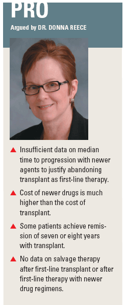 “I don’t believe we have sufficient data yet to support abandoning transplant,” said Dr. Reece, who is director of the Program for Multiple Myeloma and Related Disorders at Princess Margaret Hospital in Toronto. “The new drugs are clearly more exciting than the older drugs in our armamentarium, but we do not yet have complete data on median time to progression and survival with these newer agents. Perhaps in the future, we will have enough information to justify this paradigm shift, but that is not the case at present.”