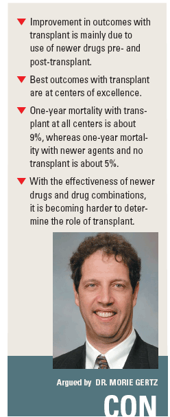 Several studies that show no survival difference between early and delayed transplant also raise questions about the use of transplant as first-line therapy (Blood 92:3131-3136, 1998; J Clin Oncol 24:929-936, 2006; Haematologica 92:928-935, 2007). Transplant carries a treatment-related mortality, depending on the center where it is performed. “The more experienced the center, the better the mortality results,” Dr. Gertz said. Registry data from nationwide centers show a one-year mortality of about 9%, “which is unacceptably high,” he said (Bone Marrow Transplantation 32:1135-1143, 2003). With novel agents and no transplant, one-year mortality is at 5% and two-year survival is about 88%.