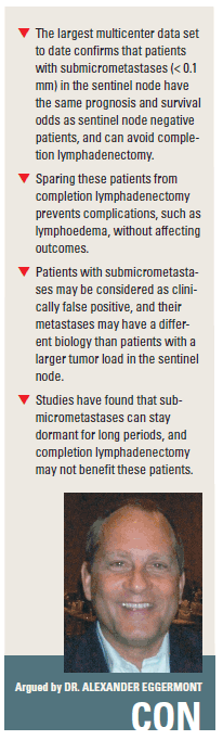 Taking the opposing side, Alexander M.M. Eggermont, MD, PhD, argued that in patients with a tumor load of less than 0.1 mm in the sentinel node, CLND does not improve survival and can result in unnecessary complications. Dr. Eggermont is head of the department of surgical oncology at the Daniel Den Hoed Cancer Center and professor of surgical oncology at Erasmus University Medical Center in Rotterdam, the Netherlands.