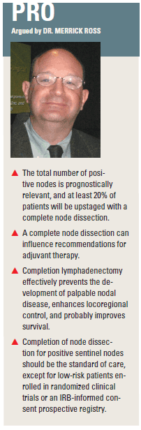 “It may be good to selectively look at excluding node dissection in these low-risk patients. However, that needs to be validated in a larger subset,” Dr. Ross said. “But it’s my feeling that completion of node dissection for positive sentinel nodes is the standard of care, and omission should only occur in a randomized clinical trial or an IRB informed consent prospective registry for low-risk patients.”