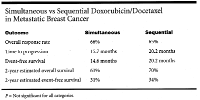 MEMPHIS-A dose-intense sequential schedule of doxorubicin/docetaxel (Taxotere) plus growth factor was no more effective than standard simultaneous administration in treating metastatic breast cancer.
