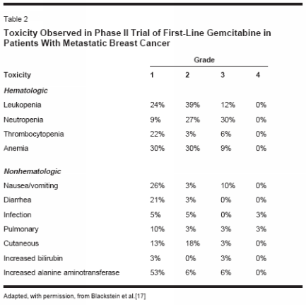 Blackstein M, Vogel CL, Ambinder R, et al: Gemcitabine as first-line therapy in patientswith metastatic breast cancer: A phase II trial. Oncology 62:2-8, 2002.