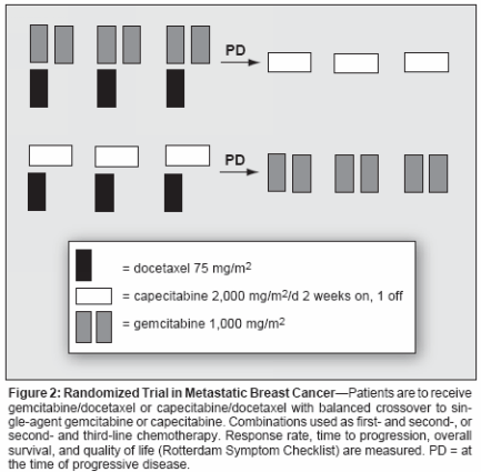 citabine (Figure 2). Results of this trial promise to be helpful in planning treatmentbeyond the first chapter in the course of metastatic disease.The other contributions to this supplement review the rationale for use of andthe outcomes observed with the promising combination of gemcitabine and paclitaxel.Joyce O'Shaughnessy reviews compelling data supporting use of the gemcitabine/paclitaxel combination and describes interim analysis findings of amultinational phase III trial comparing gemcitabine/paclitaxel with paclitaxel alonein patients with metastatic breast cancer. Carlos Delfino and colleagues explorephase II trial results for gemcitabine/paclitaxel as first-line treatment of advancedbreast cancer. Andr Murad updates findings of a phase II trial of gemcitabine/paclitaxel as salvage therapy for metastatic disease. George Sledge discusses therationale for the triple combination of gemcitabine/paclitaxel plus trastuzumab (Herceptin)and reviews findings of a phase II trial of the combination in patients withHER2-positive disease. Christoph Zielinski discusses the rationale for gemcitabine/paclitaxel/anthracycline combinations and reviews available information from trialsexamining gemcitabine/paclitaxel in combination with doxorubicin or epirubicin.
