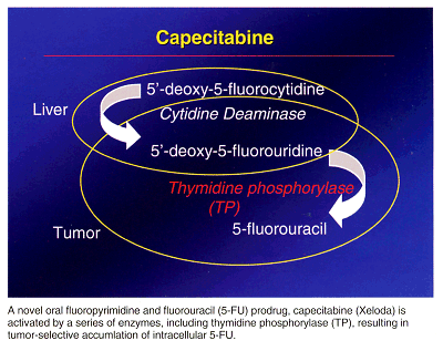 A novel oral fluoropyrimidine and fluorouracil (5-FU) prodrug, capecitabine is activated by a series of enzymes, including thymidine phosphorylase, resulting in tumor-selective accumulation of intracellular 5-FU (see figure below). The drug’s efficacy has been established in a variety of dos-ages and schedules, Dr. Hudis noted, including as a single-agent therapy in patients previously treated with anthracyclines and taxanes.
