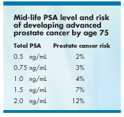 The highest PSA levels at age 44 to 50 were associated with the highest risk: About 50% of advanced cancers occurred in subjects with baseline PSA within the top 10% of PSA levels (PSA of 1.2 ng/mL or higher before age 50); more than 65% occurred in the top 20%.