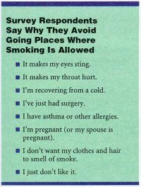 Forty percent of those surveyed answered yes when asked if they had ever avoided going someplace, public or private, because they knew they would be exposed to tobacco smoke, while only 8% said they had ever avoided going somewhere because smoking was not permitted.