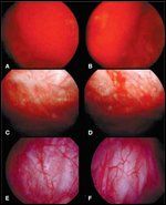 Four months later, the patient presented with progressive urinary frequency and nocturia, and a repeat cystoscopy showed pronounced erythematous patches in the right posterior wall and a new area of involvement in the left posterior wall (Figure 2 a,b). Biopsies taken
