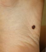 Photograph of an asymmetrical, brown lesion on the skin on the bottom of the foot.