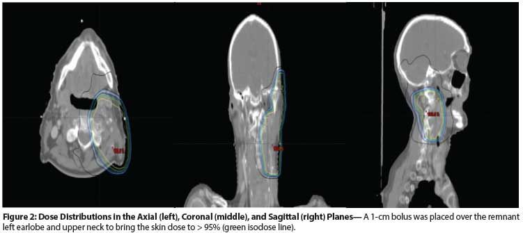 Since the patient experienced multiple local recurrences within a relatively short period of time and with the presence of a close deep surgical margin, adjuvant external beam radiotherapy (EBRT) was recommended. CT-based treatment planning (axial images at 0.25-cm intervals from the top of the head to below the sternal notch) in the supine position with custom head and shoulder Aquaplast immobilization was performed. Intravenous contrast was delivered to allow better visualization and delineation of the neck vessels. Image-guided intensity-modulated radiotherapy was delivered once a day, Monday through Friday, utilizing a 9-field technique with 6-MV photons over 7 weeks. The planning target volume was defined as any areas of potential microscopic disease with margin (the remnant left earlobe, pre- and post-auricular areas, C2–C3 cranial nerve branches and neural foramina, upper neck, and sternocleidomastoid muscle/great auricular nerve tumor bed). The patient received 50 Gy in 2.0 Gy fractions. An additional 16 Gy in 2.0 Gy fractions was delivered to the remnant left earlobe and sternocleidomastoid muscle/great auricular nerve tumor bed for a total dose of 66 Gy in 33 fractions (Figure 2).