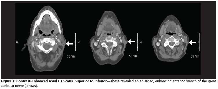 The Case: A 74-year-old man presented with a 2.5-cm ulcerated mass occupying the middle third of his left outer ear, approximating the helical rim. He underwent wide local excision with placement of a full-thickness skin graft. Pathology results were positive for moderately differentiated invasive squamous cell carcinoma (SCC), with a 1-mm focus of residual SCC identified at the peripheral re-excision margin. He underwent excision of a local recurrence 3 months later, and excision of a new mass near his antitragus 3 months after that. A physical examination 4 months after excision of the new mass revealed a dense cord of thickened tissue in the expected location of the great auricular nerve. Biopsy results were positive for SCC with perineural involvement.