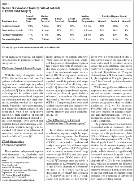 Langer CJ, Manola J, Bernardo P, et al:Cisplatin-based therapy for elderly patientswith advanced non-small cell lung cancer: Implicationsof Eastern Cooperative OncologyGroup 5592, a randomized trial. J Natl CancerInst 94:173-181, 2002.