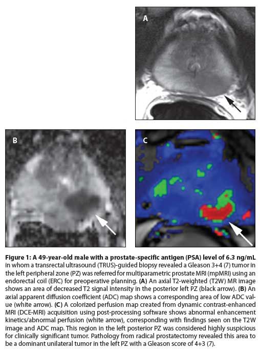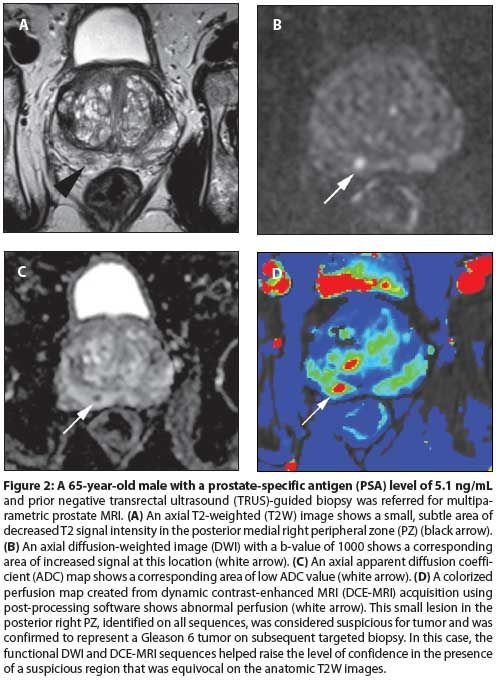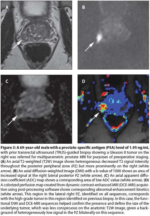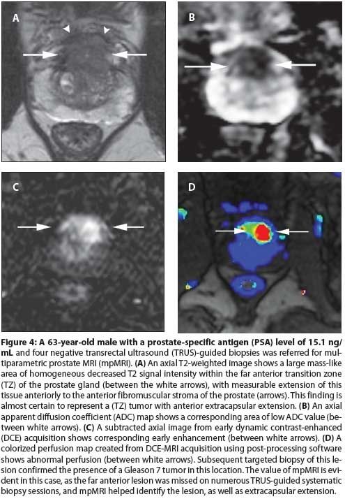 MpMRI can contribute significantly to patient care by facilitating more accurate lesion localization, especially in anterior tumors that can be missed on TRUS-guided biopsy (Figure 4). It is difficult to draw precise conclusions from the available literature about which sequences are best for lesion localization. However, it is generally accepted that two functional sequences, in addition to T2WI, should be included in a multiparametric prostate exam. Riches et al described the performance of T2WI, DWI, DCE-MRI, and MRSI compared with histopathology after radical prostatectomy, and found that any two functional sequences (in addition to T2WI) were better than any one functional sequence; adding a third functional sequence did not result in significant further improvement in diagnostic performance.[39] On the other hand, in a more recent report, adding all three functional sequences to T2WI achieved a positive predictive value of 98%.[15]