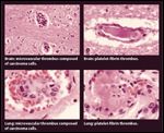 Occult malignancies as a cause of unexpected microangiopathic hemolytic anemia (MAHA) and thrombocytopenia are an uncommon but critical clinical problem. The clinical problem is emphasized and illustrated by a patient whose case we have previously reported, a 52-year-old woman who presented with sudden onset of acute abdominal pain and syncope 3 years after resection of breast carcinoma and adjuvant chemotherapy.[1] Her hematocrit was 26% with evidence of microangiopathic hemolysis (many fragmented red cells on her blood smear, increased indirect bilirubin [3.9 mg/dL] and lactate dehydrogenase [LDH; 1431 U/L] levels, negative direct Coombs test), and her platelet count was 17,000/µL. Coagulation studies, including fibrinogen level, were normal. She had been in continuous remission for the past 3 years, and computed tomographic (CT) scans showed no evidence of recurrent carcinoma. Thrombotic thrombocytopenic purpura (TTP) therefore was assumed to be the cause of this sudden illness, and plasma exchange treatment was started. The patient developed respiratory distress; spiral CT documented multiple bilateral pulmonary emboli and echocardiogram documented a dilated, akinetic right ventricle. She died 3 days after the diagnosis of TTP. I assumed that the autopsy would demonstrate multiple pulmonary emboli as the cause of her death, but I was very surprised to learn that the gross autopsy was normal. No pulmonary emboli were seen; there was no evidence of recurrent carcinoma; no cause of death was established. Therefore I assumed that she had TTP with very unusual clinical manifestations, and I assumed that the microscopic examination would demonstrate microvascular platelet thrombi in multiple organs, the characteristic pathologic abnormality of TTP. My second great surprise came several weeks later, when the pathologist called to tell me about the microscopic findings. Small intravascular clusters of metastatic carcinoma cells, consistent with breast carcinoma, were present in arterioles and capillaries of nearly every section of the lungs, brain, heart, liver, spleen, lymph nodes, and marrow. The vessels were occluded by tumor emboli and also by platelet-fibrin thrombi, which must have accumulated proximal to the tumor cells (see Figure). The platelet-fibrin thrombi were similar to the characteristic pathologic feature of TTP, however in this patient the thrombi were the result of microvascular obstruction by microscopic tumor emboli. Therefore this patient had acute and fatal malignancy-associated thrombotic microangiopathy (TMA) that was mistakenly diagnosed as TTP. The lesson I learned was that because of her atypical clinical features, we should have been more aggressive in our evaluation, which should have included a bone marrow biopsy. This might have revealed the correct diagnosis and could have enabled the patient to avoid inappropriate plasma exchange treatment.