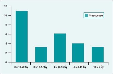 Another problem with the stereotactic approach is that there is no agreed-on dose as demonstrated by the ASTRO survey (see Figure 2). "When Dr. Kong conducted her survey, she asked people what treatment they used. Some people preferred three fractions, some preferred four, some five, some preferred 10. The doses ranged from 6 Gy to 20 Gy," Dr. Ball said. "Now when I see a spread of data like this, and all treating the same disease process, my immediate reaction is, 'Do these guys really know what they're doing?'"