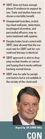 It's true that SBRT has a lot of bells and whistles, but are proponents guilty of worshiping technology for technology's sake? Quite possibly, said David Ball, MD, deputy director of the division of radiation oncology at Peter MacCallum Cancer Centre in Melbourne. While SBRT offers no shortage of razzle-dazzle, it lacks the clinical and scientific evidence to support its routine use in stage I, inoperable NSCLC, he said.