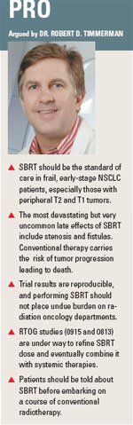 The question with SBRT isn't so much whether it should be used in frail NSCLC patients, Dr. Timmerman said, but rather does it qualify as a new standard of care? "Do we have a new standard of care? I've listed here a number of things that I think would be required to say that [SBRT] is a new standard of care," he said.