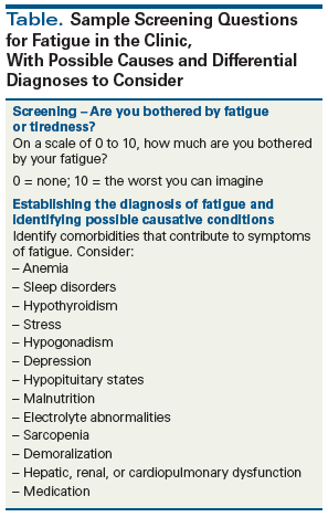 Table. Sample Screening Questions for Fatigue in the Clinic, With Possible Causes and Differential Diagnoses to Consider