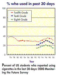 WASHINGTONWhat a difference a year makes. Cigarette smoking dropped significantly among middle school and high school students between 1999 and 2000, according to a new federally funded report. For example, the percentage of high school seniors who had smoked at least once in the month prior to being surveyed fell from 34.6% to 31.4% (Figure). Those 12th graders who smoked a half pack of cigarettes or more each day declined from 13.2% to 11.3%.