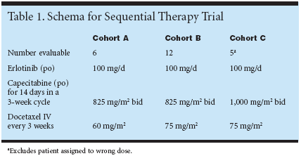 CHICAGO-An open-label, phaseIB study found that the combination oferlotinib (Tarceva), docetaxel (Taxotere),and capecitabine (Xeloda) is generally welltolerated and shows antitumor activity(ASCO poster 180). Data from a pharmacokineticanalysis indicate that there is nopharmacokinetic interaction between eithercapecitabine or docetaxel and erlotiniband its metabolite in the treatmentof metastatic breast cancer.The study was based on previous workthat showed the HER1 epidermal growthfactor receptor (EGFR) is expressed inbreast tumors, where it is thought to playa role in tumor growth and progression."Erlotinib is an orally active, potent,selective inhibitor of the HER1/EGFRtyrosine kinase with clinical activity forthe treatment of solid tumors," theinvestigators reported in their poster atASCO. R. Jones, MD, of the BeatsonOncology Centre in Glasgow, UK, was thelead author.