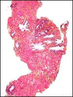 Intermediate magnification micrograph of prostate adenocarcinoma; needle core biopsy; HPS stain; source: Wikimedia Commons user Nephron