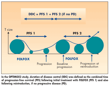 The OPTIMOX1 strategy arm then received maintenance with a simplified regimen of leucovorin 400 mg/m2, followed by a 5-FU 400 mg/m2 bolus and 5-FU 3,000 mg/m2 46-hour infusion. Upon "baseline progression," patients in both arms received modified FOLFOX7 for six more cycles. Baseline progression was defined as regrowth of the tumor to its baseline size. At this point, or when patients became symptomatic, FOLFOX7 was reintroduced in both arms.