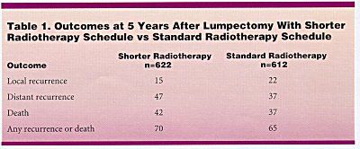 The radiation schedule of 42.5 Gy in 16 fractions is as good as 50 Gy in 25 fractions in preventing local recurrence and producing a good cosmetic result, Dr. Whelan commented. The shorter schedule would also allow almost 50% more patients to be treated with available resources.