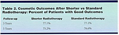 Dr. Whelan also reported that there were no significant differences in disease-free survival or overall survival, and that cosmetic outcomean indicator of late morbidity following radiation therapywas equivalent on both treatment arms (see Table 2).
