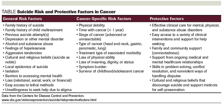 A diagnosis of cancer invariably brings thoughts of mortality to the forefront of patients’ minds and may be associated with stigma, social isolation, and personal stressors. While there are many risk factors associated with suicide in both cancer and non-cancer settings, the primary issue for patients with cancer is that the disease leads to physical, mental, and spiritual strains on personal resources. These factors overlay predispositional personal characteristics and may lead to depression and suicide. The actual rate of suicide in cancer patient populations is likely underreported due to “accidental” or unintentional deaths resulting from medication mismanagement, for example. Suicidal thinking exists on a spectrum, from transient passive thoughts about suicide, to active thinking, ruminating, planning, enacting (gesturing), and completing suicide. The key to suicide prevention is identification and proactive management of patients in the oncology setting with a team approach. This article will review the prevalence of suicide in patients with cancer, risk factors, related conditions (eg, suicidal ideation, desire for hastened death), and interventions to identify and treat suicidal patients.