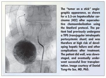 Dr. Sze cited two landmark randomized trials showing that chemoembolization reduces the risk of death by about half relative to supportive care in patients with HCC (Lancet 359:1734-1739, 2002, and Hepatology 35:1164-1171, 2002).The technical aspects of superselective chemoembolization are still debated, Dr. Sze noted. "Our protocol at Stanford is to maximize the superselectivity with microcatheters and minimize the amount of solid particulate embolization we use," he said. The Stanford protocol is derived from those widely used in Asia.Angiographically, this procedure produces a characteristic "tumor on a stick" appearance (see Figure).