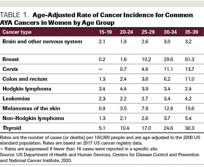 For AYA women, the cancers with the highest incidence rates are breast cancer, thyroid cancer, and lymphoma.14(Table 1) A growing body of research studies suggests that AYAs have biological and genetic differences from pediatric and older adult patients with cancer.2 For example, AYA breast patients with cancerare more likely to present with genetic mutations, making the cancer more aggressive and harder to treat than in older adult patients. Triple-negative breast cancer is overrepresented in the AYA patient population. Thyroid cancer and lymphomas in AYAs are also more likely to exhibit mutational characteristics than in older adult patients. Due to this, and to their relative health compared with older adults, AYA patients with cancer are more likely to receive aggressive therapy regimens.14