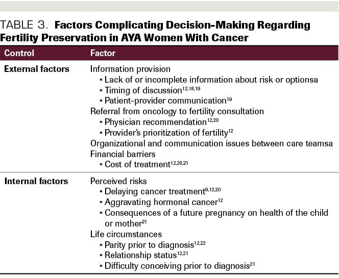 Table 3. Factors Complicating Decision-Making Regarding Fertility Preservation in AYA Women With Cancer