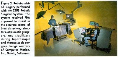 The basic set-up for robot-assisted laparoscopy includes the surgeon’s viewing and control console and the surgical arm unit that positions and maneuvers detachable surgical instruments. The Marescaux group used the ZEUS Robotic Surgical System (Computer Motion, Goleta, California), which was approved on October 9, 2001, by the FDA for sale in the United States
