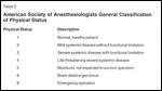 Surgical risk can be assessed in several ways. One of the most widely used tools for estimating risk from anesthesia alone is the American Society of Anesthesiologists (ASA) General Classification of Physical Status. The mortality rate, as related to anesthesia, is classified in one of five categories depending on the physical status of the patient (Table 2).[6]