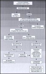 When a suspicious pulmonary lesion is identified, a fine-needle biopsy may not be necessary to establish the diagnosis, especially in a high-risk patient (Figure 2). An excisional biopsy at surgical exploration is recommended. However, exploration may be negative in up to 16% of patients.[11] Patients are eligible for metastasectomy if the following criteria are fulfilled: (1) disease at the primary site is controlled; (2) the patient has no other extrathoracic disease; (3) the patient has no significant comorbidities contraindicating a thoracotomy; (4) pulmonary function tests indicate that the patient can tolerate complete resection; (5) there is no extensive involvement of the mediastinum or chest wall; and (6) there is a reasonable likelihood that a curative resection can be performed.