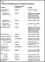 Casson et al reviewed the results of repeat pulmonary metastasectomies in 34 patients with soft-tissue sarcoma. Resectability was the best predictor of survival. Patients with solitary nodules had a median survival of 65 months, as compared with 14 months in patients with two or more nodules (Table 5).